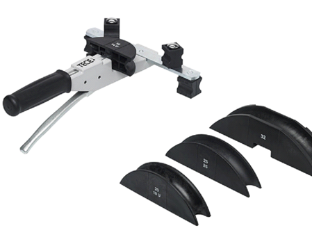 Kompakter Einhand-Rohrbieger Dimension 16-32 mm für TECEflex und TECElogo Mehrschichtverbundrohre zum Herstellen von gleichmäßigen Rohrbögen. Komplett im Koffer mit Biegesegmenten 16/20/25/32 mm. Biegewinkel 0-90°.